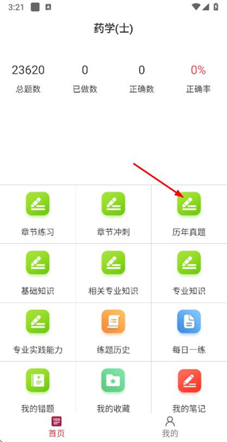 1、在首页点击历年真题选项,进入历年真题页面。