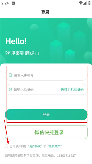 3、在登录页面,勾选协议后选择微信快捷登录,可通过微信完成账号登录。