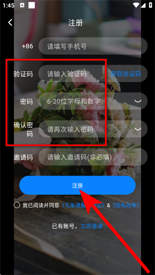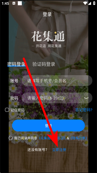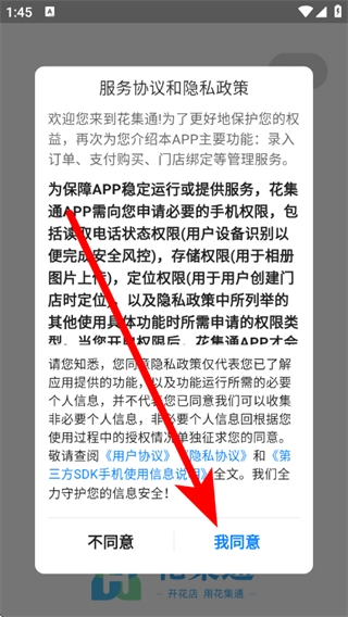 1、打开花集通,在弹出隐私政策提示框,点击我同意,进入登录界面。
