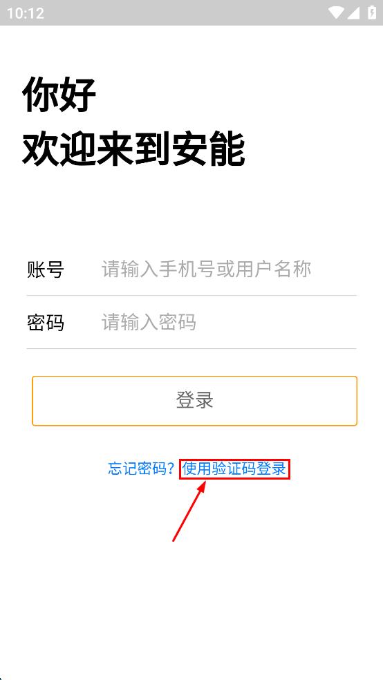 1、进入安能的欢迎界面,点击“使用验证码登录”选项,切换至验证码登录页面。