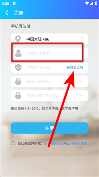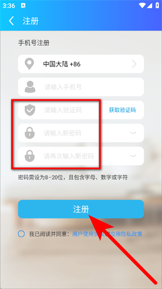 4、输入验证码、设置新密码及确认密码后,勾选协议,点击注册,完成注册。