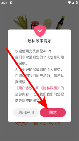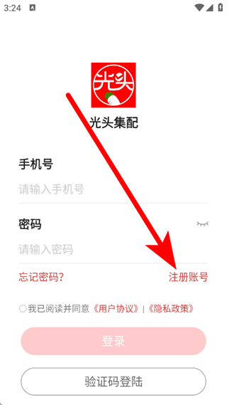 1、打开光头集配,在弹出隐私政策提示框,点击同意,进入登录界面。