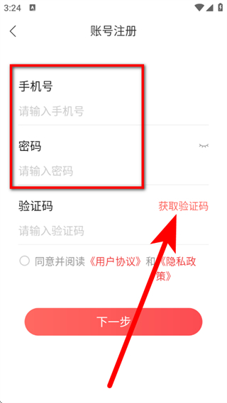 3、在注册页面,输入手机号和密码后,点击获取验证码。