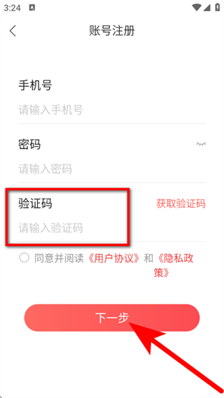 4、在输入框输入验证码,勾选协议后,点击下一步,完成注册。