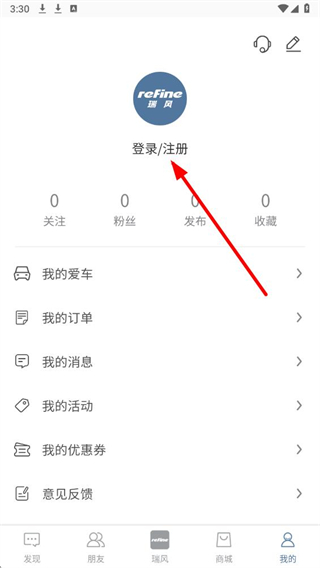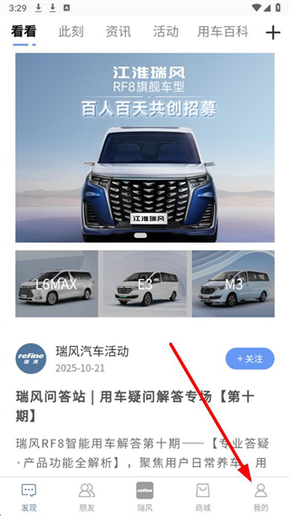 1、打开瑞风汽车应用,点击底部我的选项,进入个人相关界面。