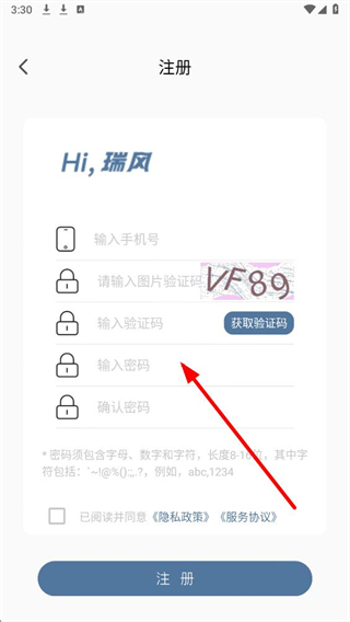 4、在注册页面,依次填写手机号、验证码、密码并确认,勾选协议后,点击注册完成注册。
