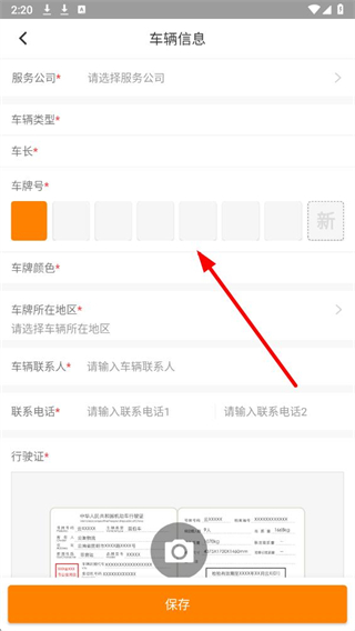 4、按页面提示填写信息,并上传行驶证照片,填写完成后点击保存,即可完成车辆信息的添加。