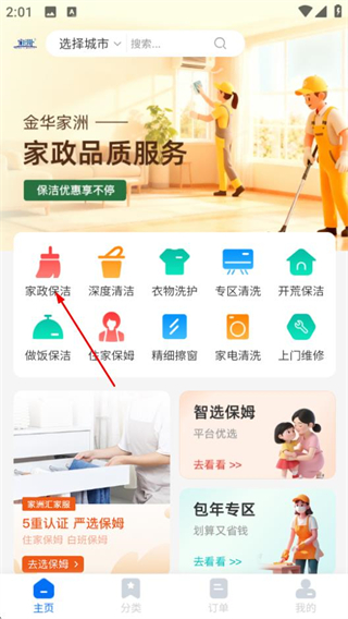 1、在家洲首页,点击家政保洁选项,进入钟点保姆服务页面。