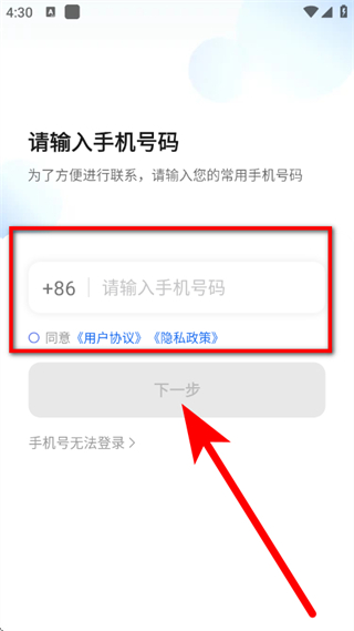 2、在手机号页面,输入手机号码,勾选协议后,点击下一步。