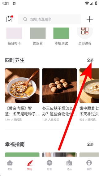 2、在知食页面,点击四时养生右侧的全部,进入内容列表页面。