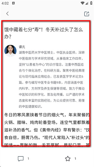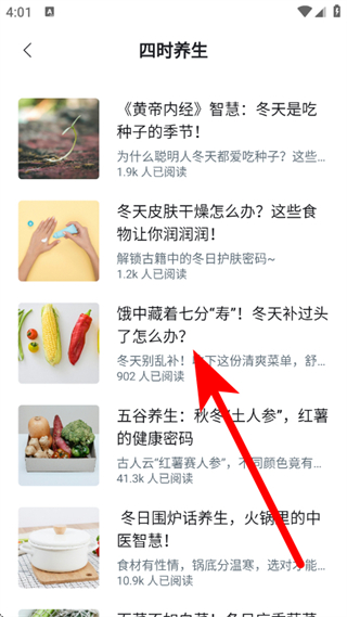 3、在四时养生列表,点击选择目标文章,进入内容详情页面。