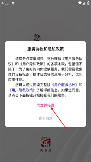 1、在服务协议和隐私政策弹窗中,点击同意,进入登录页面。