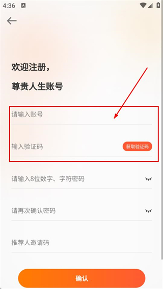 3、在注册页面,填写账号,然后填写收到的验证码,进行下一步的操作。