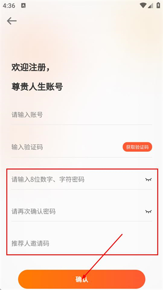 4、在注册页面,继续填写密码和确认密码后,点击确认,完成天下城的账号注册。