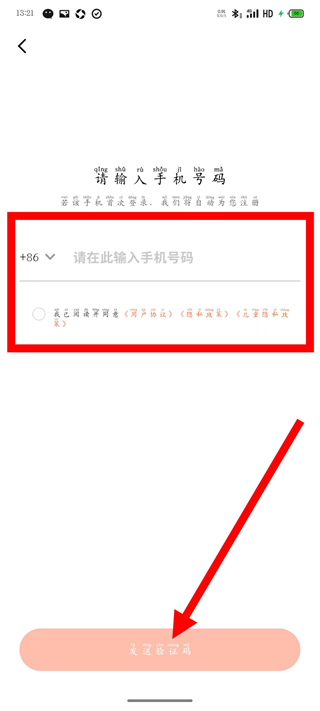 3、在请输入手机号码页面,输入手机号并勾选协议,点击发送验证码。
