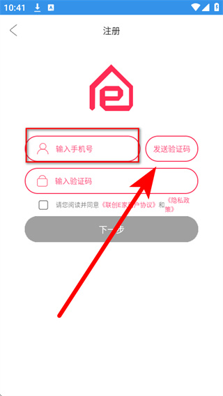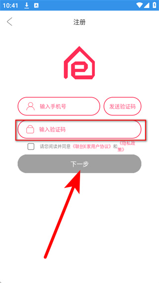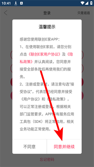 1、打开联创E家,在弹窗中点击同意并继续,进入登录页面。