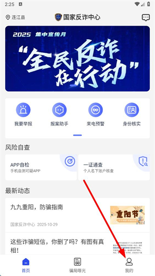 1、打开国家反诈中心app,点击底部我的选项,进入个人界面。
