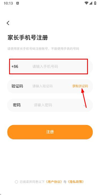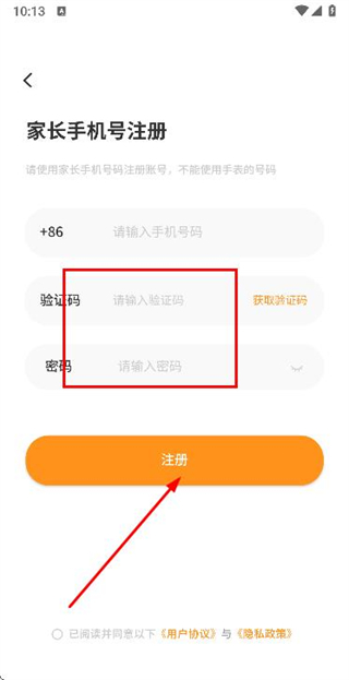 3、在注册账号页面填写验证码和密码,勾选协议后点击注册完成账号注册操作。