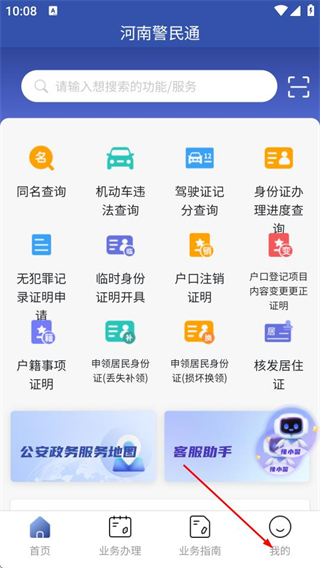 1、在河南警民通首页,点击底部的我的选项,进入个人页面。