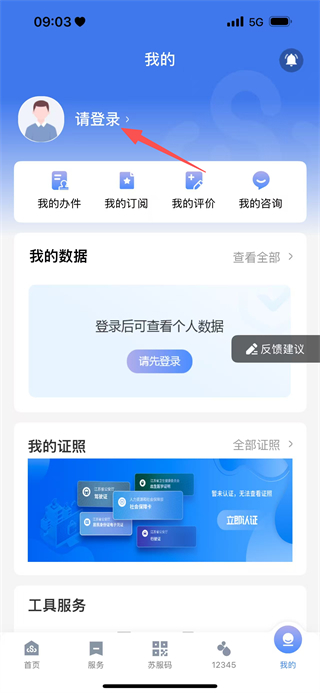 3、在个人页面中,点击请登录选项,进入苏服办的登录页面。