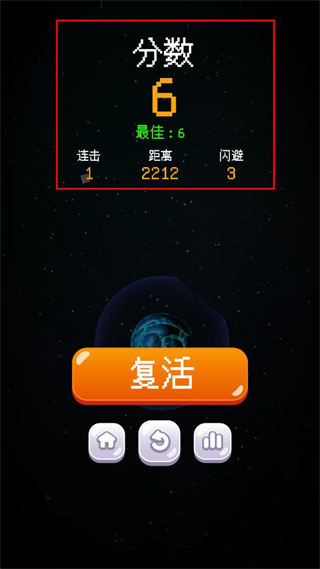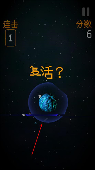 3、若飞船碰撞到星球,界面会出现复活提示,此时可选择是否进行复活操作以继续游戏。