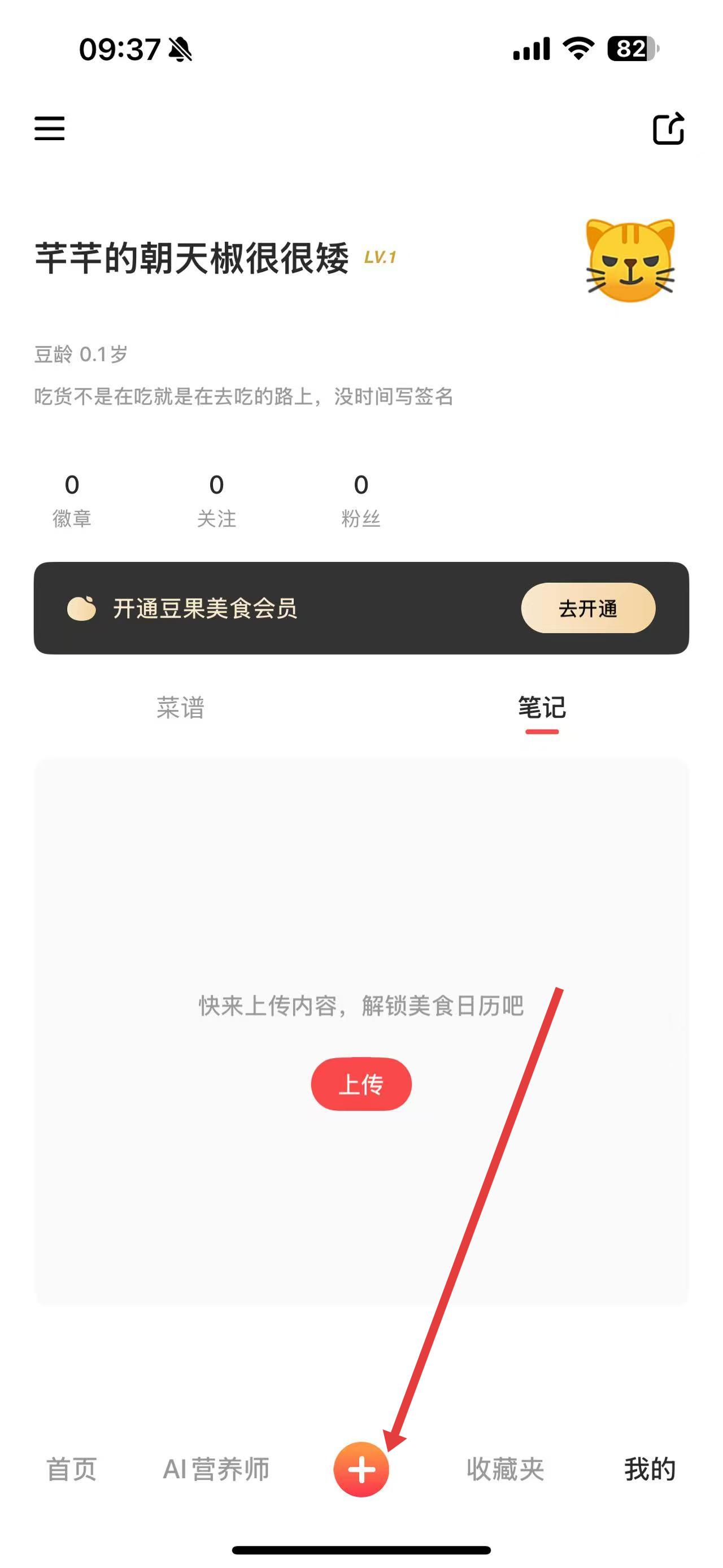 1、打开豆果美食APP,进入我的页面,点击底部导航栏中间的加号图标。