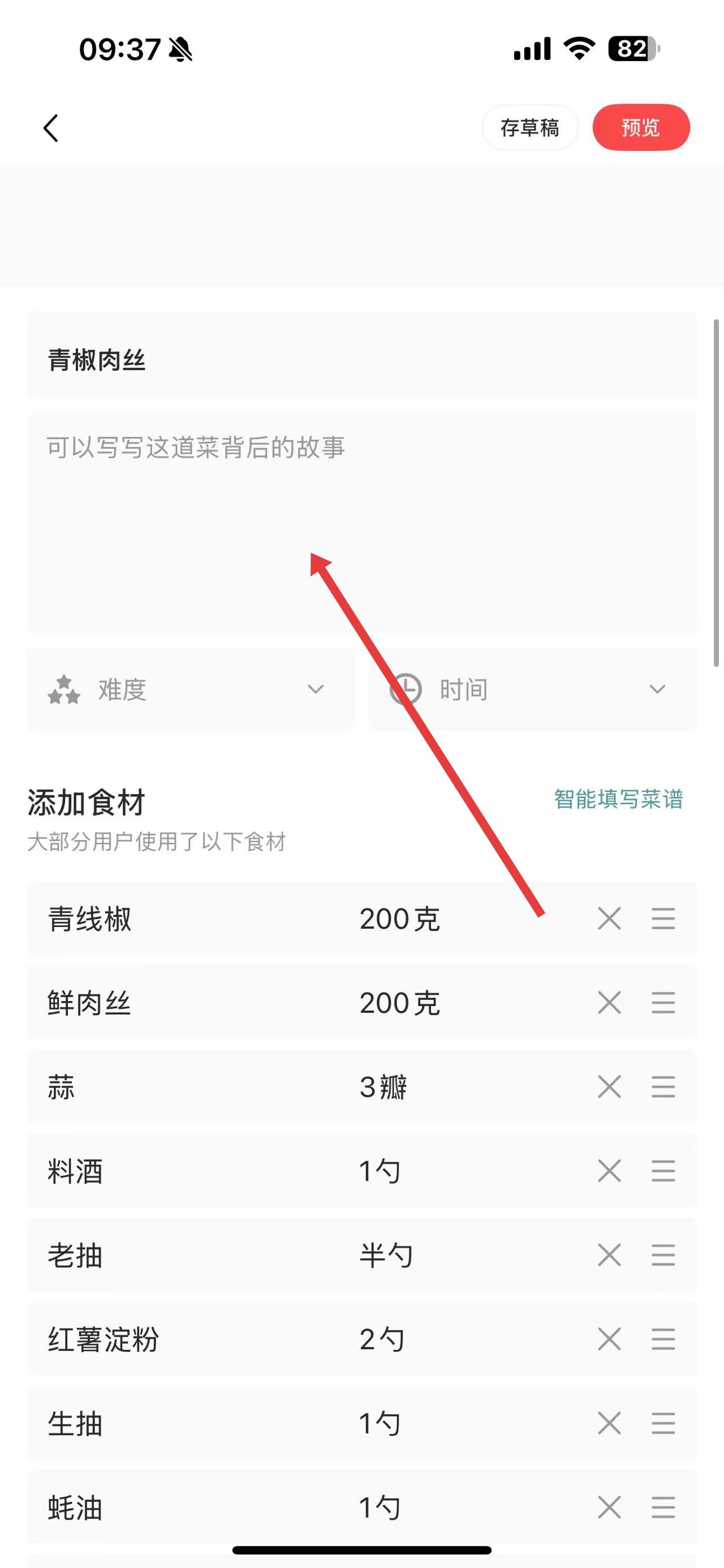 4、接着可以在相应区域填写这道菜背后的故事,选择菜谱难度、制作时间,并准确添加所需食材及用量等信息。