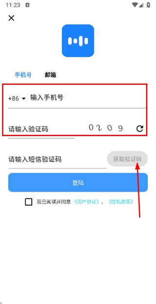2、在手机登录页面填写手机号和图片验证码,勾选协议后,点击获取验证码。