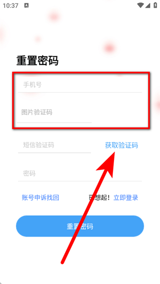2、在重置密码页面,输入手机号和对应的图片验证码,点击获取验证码。