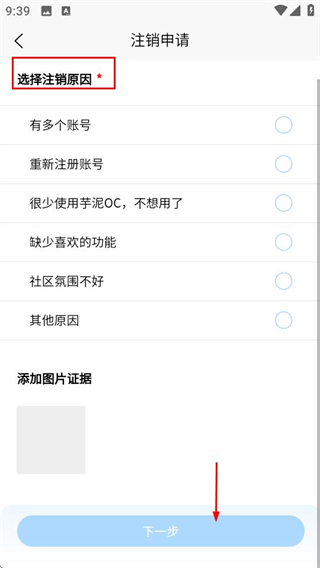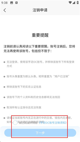 4、在注销申请页面,勾选协议后点击下一步,进入注销原因选择页面。