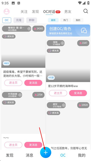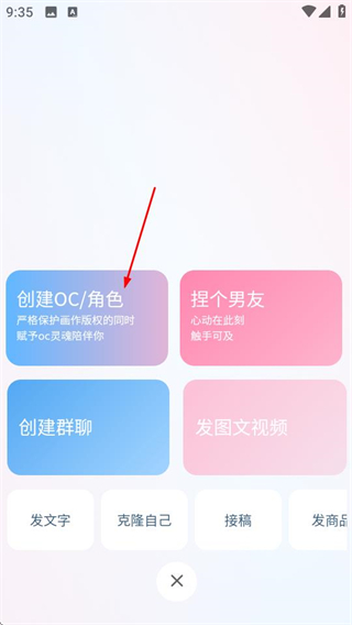 1、在芋泥OC首页,点击底部的+按钮,展开功能选择菜单。