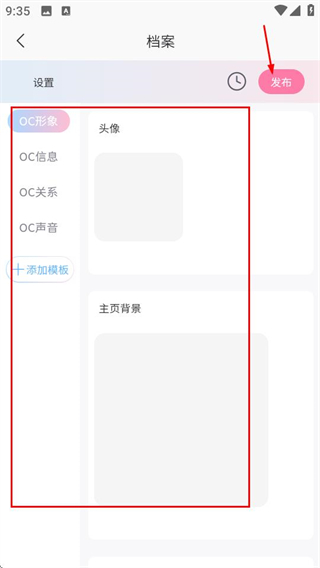 3、在档案页面,完善OC信息后点击发布按钮,即可完成OC创建。