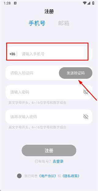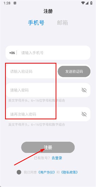 3、在注册账号页面填写验证码和密码,勾选协议后点击注册完成账号注册操作。
