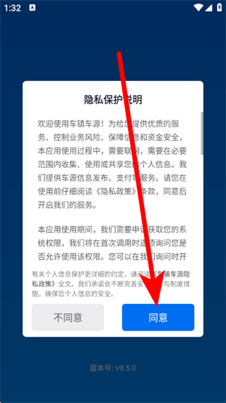 1、打开车镇车源,在隐私保护说明弹窗中,点击同意。