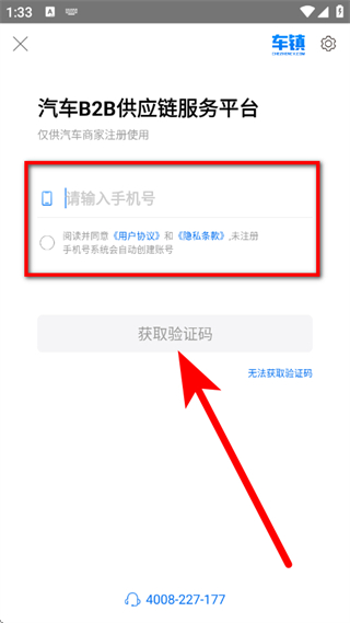 3、在平台页面,输入手机号,勾选协议后,点击获取验证码。