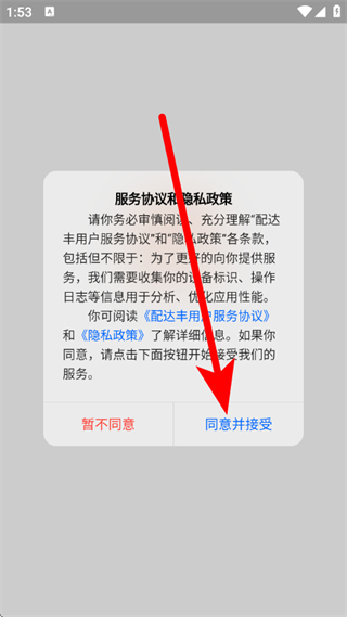 1、打开配达丰,在弹出提示框,点击同意并接受,进入欢迎页面。