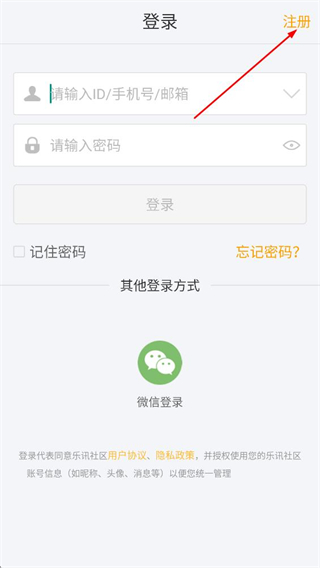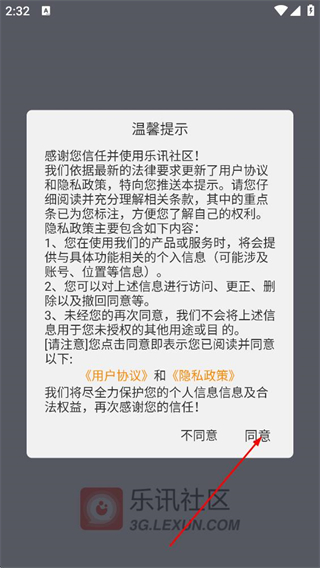1、在乐讯社区的温馨提示弹窗中,点击同意,进入登录页面。