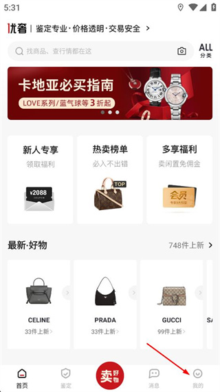 1、打开优奢奢侈品软件,进入首页后找到下方功能栏里的我的选项,点击进入对应页面。