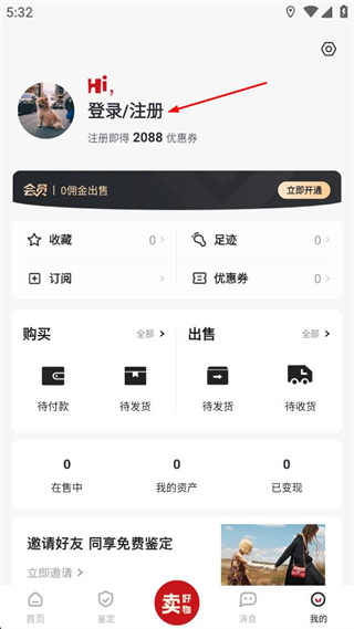 2、在我的页面中,找到登录注册选项,点击该选项后进入登录享更多专属权益界面。