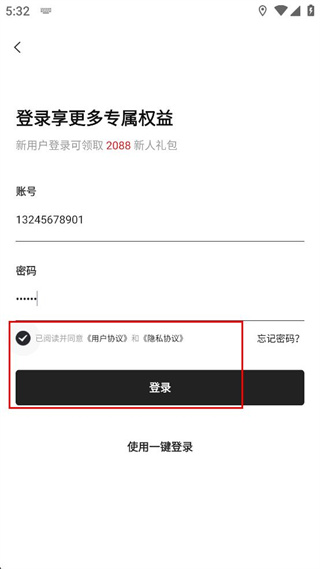 4、确认信息填写完整且协议已勾选后,找到界面里的登录按钮并点击,完成账号登录。