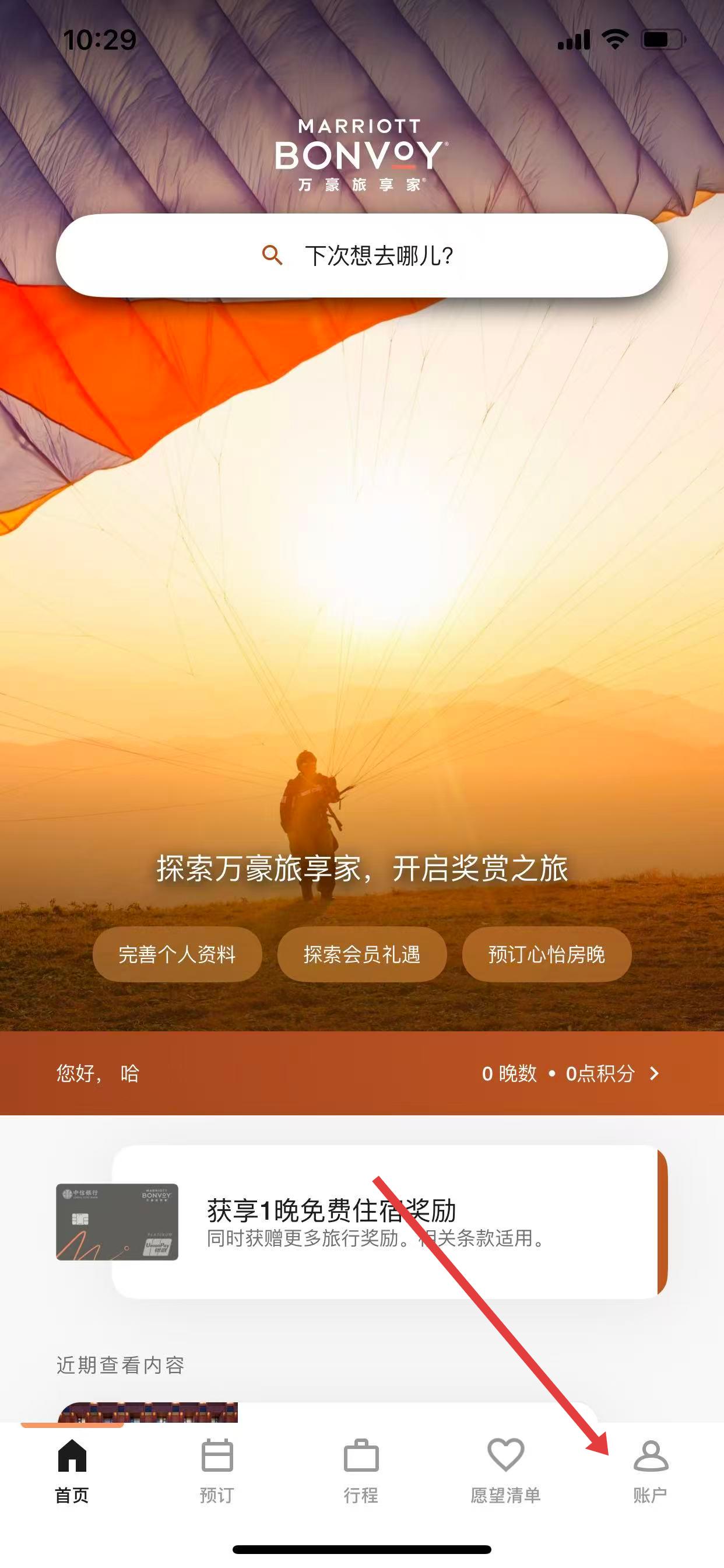 1、打开万豪旅享家APP,点击底部导航栏最右侧的账户。