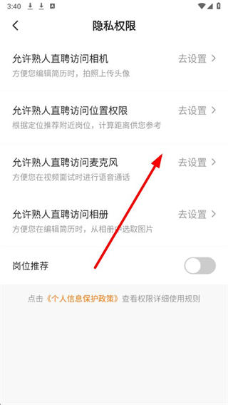 4、在隐私权限页面,可看到权限选项,点击对应权限的去设置,即可跳转页面调整权限状态。