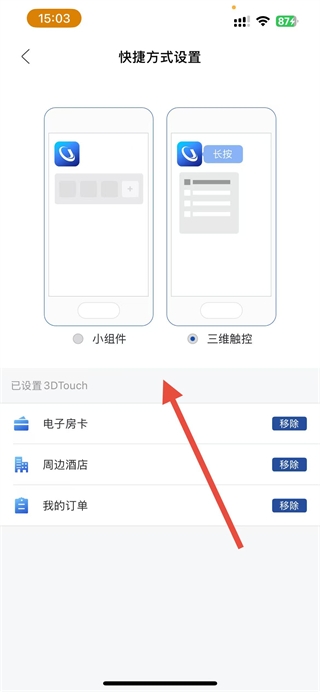5、在页面可选择小组件或三维触控模式,并管理电子房卡、周边酒店等快捷功能,完成设置。