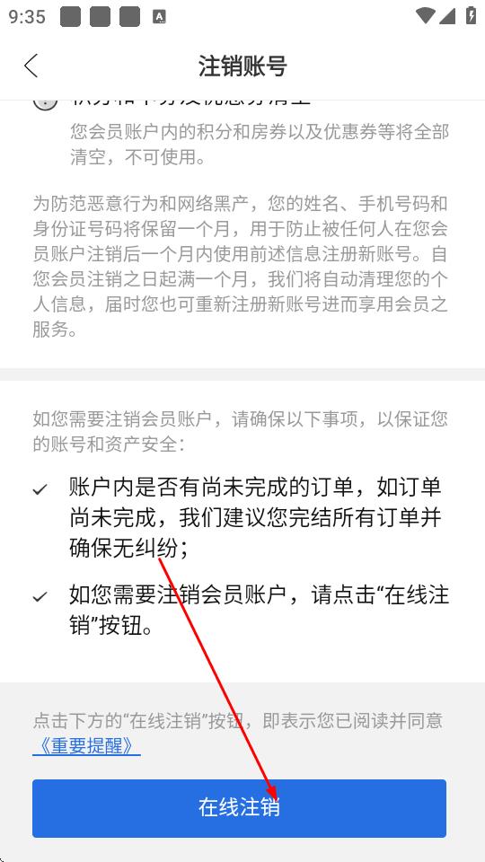 6、在注销账号页面,点击在线注销。