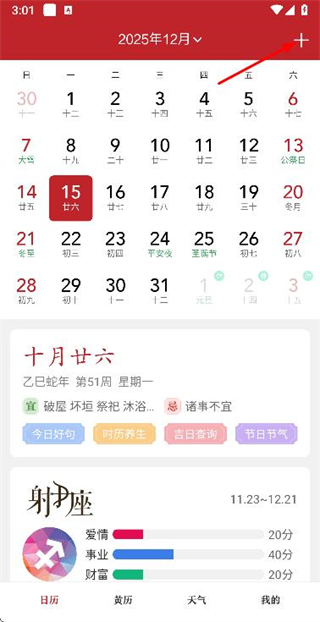 1、在日历页面点击右上角的加号按钮,弹出功能选择菜单。
