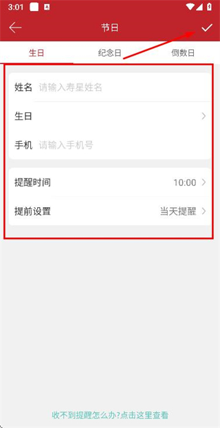 4、在生日信息填写页面完善内容后,点击右上角的对勾按钮完成生日记录的添加。