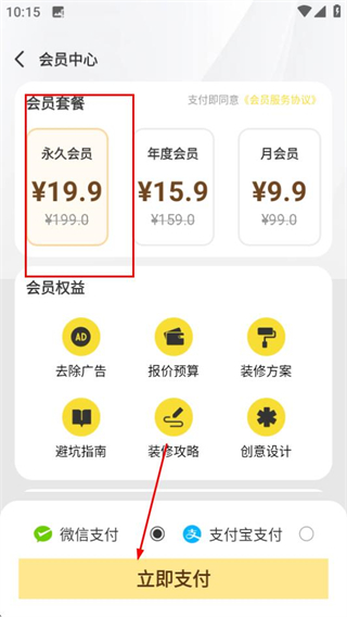 3、在会员中心页面,选定会员套餐后点击立即支付,即可开通会员权益。