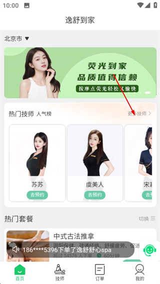 1、在逸舒到家应用首页,点击底部的技师选项,进入技师列表页面。