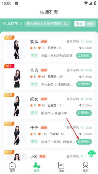2、在技师列表页面,选择目标技师后点击立即预约,进入服务选择页面。