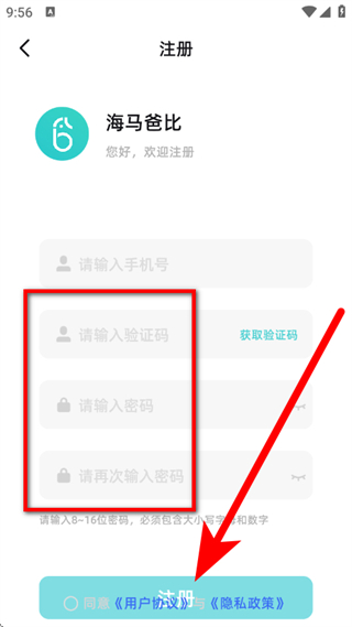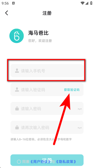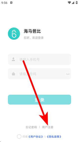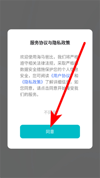 1、打开海马爸比,在弹出的服务协议与隐私政策弹窗中,点击同意。